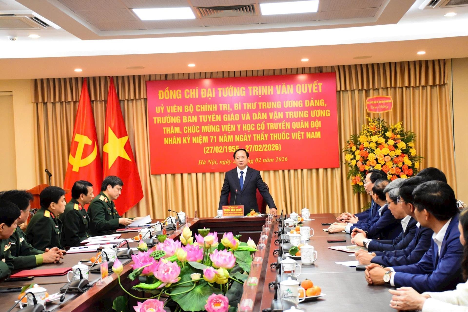 Đại tướng Trịnh Văn Quyết trao tặng lẵng hoa chúc mừng nhân dịp kỷ niệm Ngày Thầy thuốc Việt Nam. Ảnh: Hoa Duy