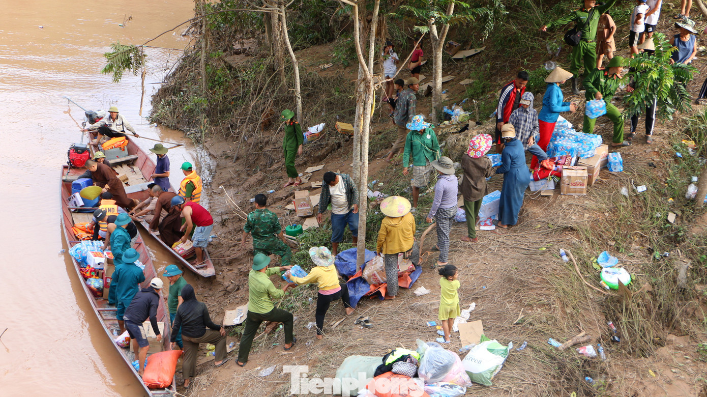 Cán bộ, chiến sĩ vận chuyển nhu yếu phẩm hỗ trợ người dân vùng bị cô lập sau bão lũ.