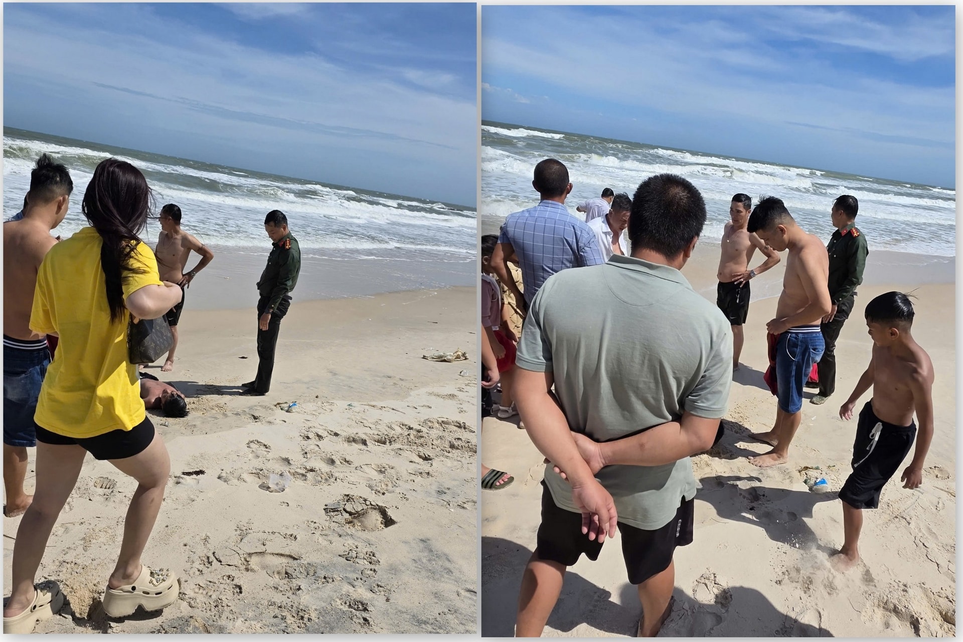 Lúc này, biển động mạnh, sóng lớn liên tục đánh vào khu vực gần bờ, khiến hai cháu nhỏ chới với giữa các đợt sóng, có nguy cơ bị cuốn ra xa. Không chần chừ, Đại úy Lê Đình Thành nhanh chóng tiếp cận hiện trường, lao xuống nước đưa các cháu vào bờ an toàn sau ít phút nỗ lực.