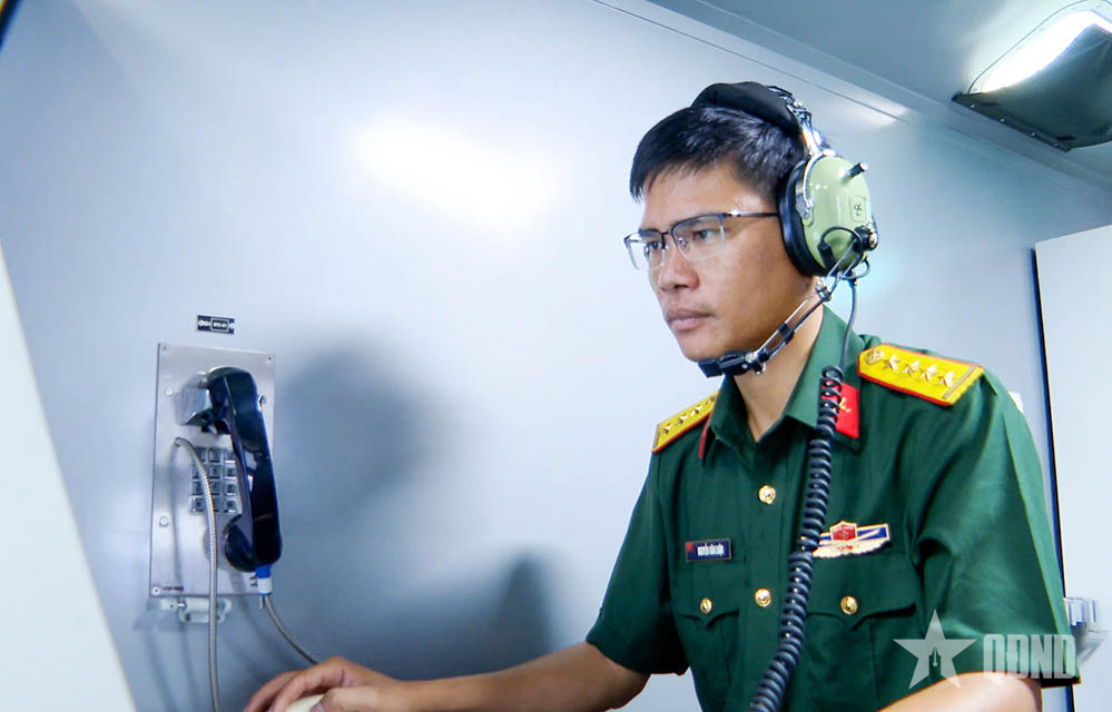 Đại úy Nguyễn Văn Luận (bên trái) chỉ huy kíp trực trên hệ thống trinh sát điện tử hiện đại.