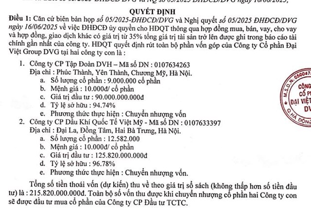 HĐQT Công ty cổ phần Đại Việt Group (mã ck: DVG) vừa thông qua chủ trương rút toàn bộ phần vốn góp tại 2 công ty con.