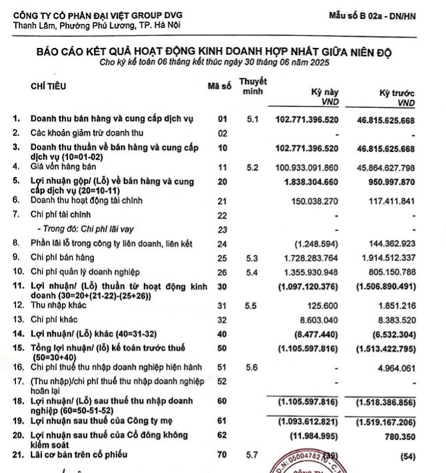 Về bức tranh tài chính, theo báo cáo hợp nhất bán niên 2025 sau soát xét, DVG ghi nhận doanh thu thuần đạt 102,7 tỷ đồng trong 6 tháng đầu năm 2025, tăng gấp hơn 2 lần so với cùng kỳ năm 2024.