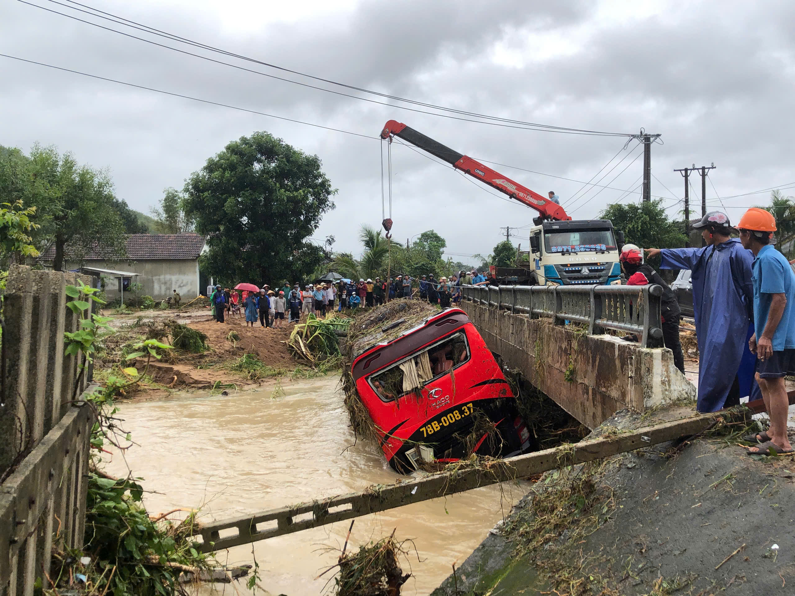 * Chiều cùng ngày, lực lượng chức năng xã Xuân Phước trục vớt một xe khách giường nằm, mang biển kiểm soát 78B-008.xx bị lũ cuốn trôi và kẹt lại tại một cây cầu trên địa bàn.