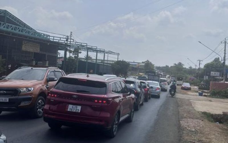 Đoàn xe xếp hàng dài trên quốc lộ 26 do bốn ô tô tông nhau liên hoàn. Ảnh: N.D