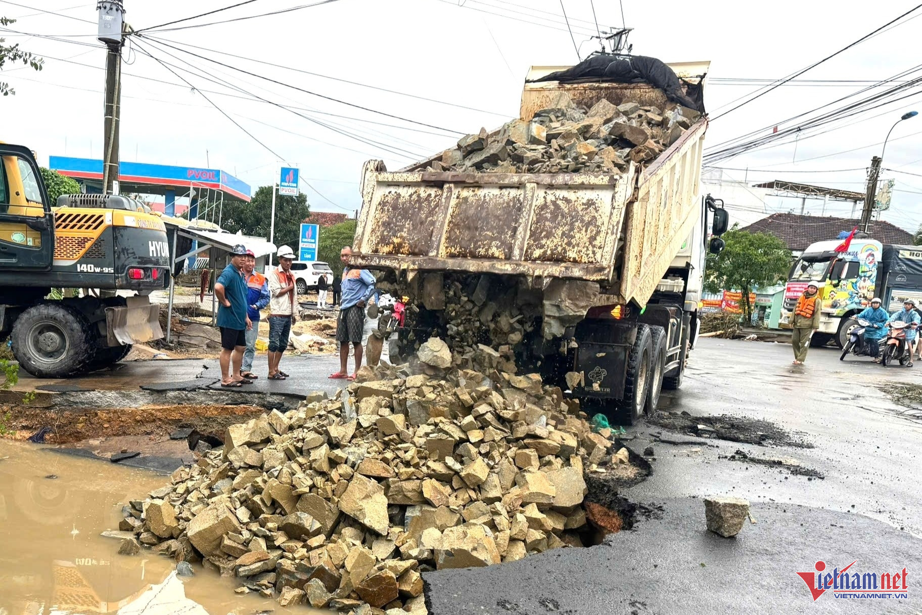 Lực lượng chức năng đang sửa đường vào xã Hòa Thịnh. Ảnh: Hải Dương
