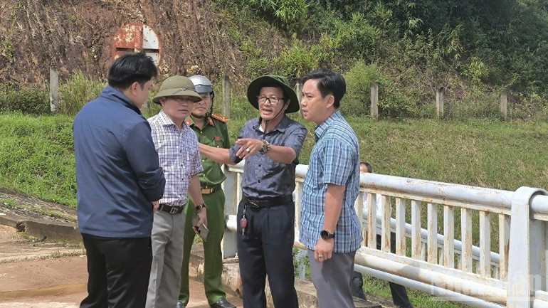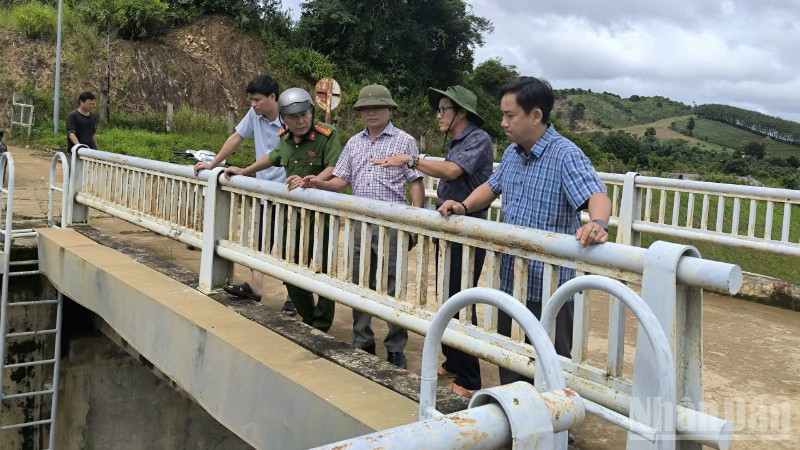 Lãnh đạo Giám đốc Công ty trách nhiệm hữu hạn một thành viên quản lý công trình thủy lợi Đắk Lắk phối hợp các ngành chức năng kiểm tra các hồ đập, công trình thủy lợi trên địa bàn xã Ea Ô.