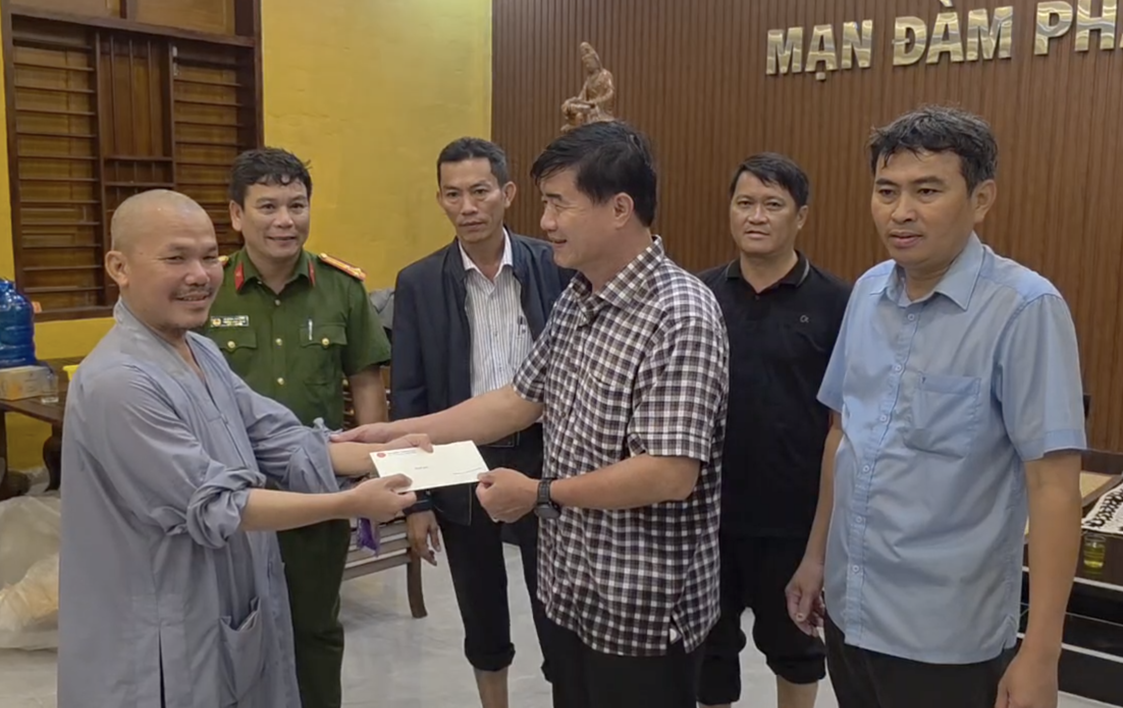 Ông Nguyễn Thiên Văn trao tiền hỗ trợ đến đại diện Chùa Thanh Lương để lo lương thực, thực phẩm cho bà con trong thời gian trú bão