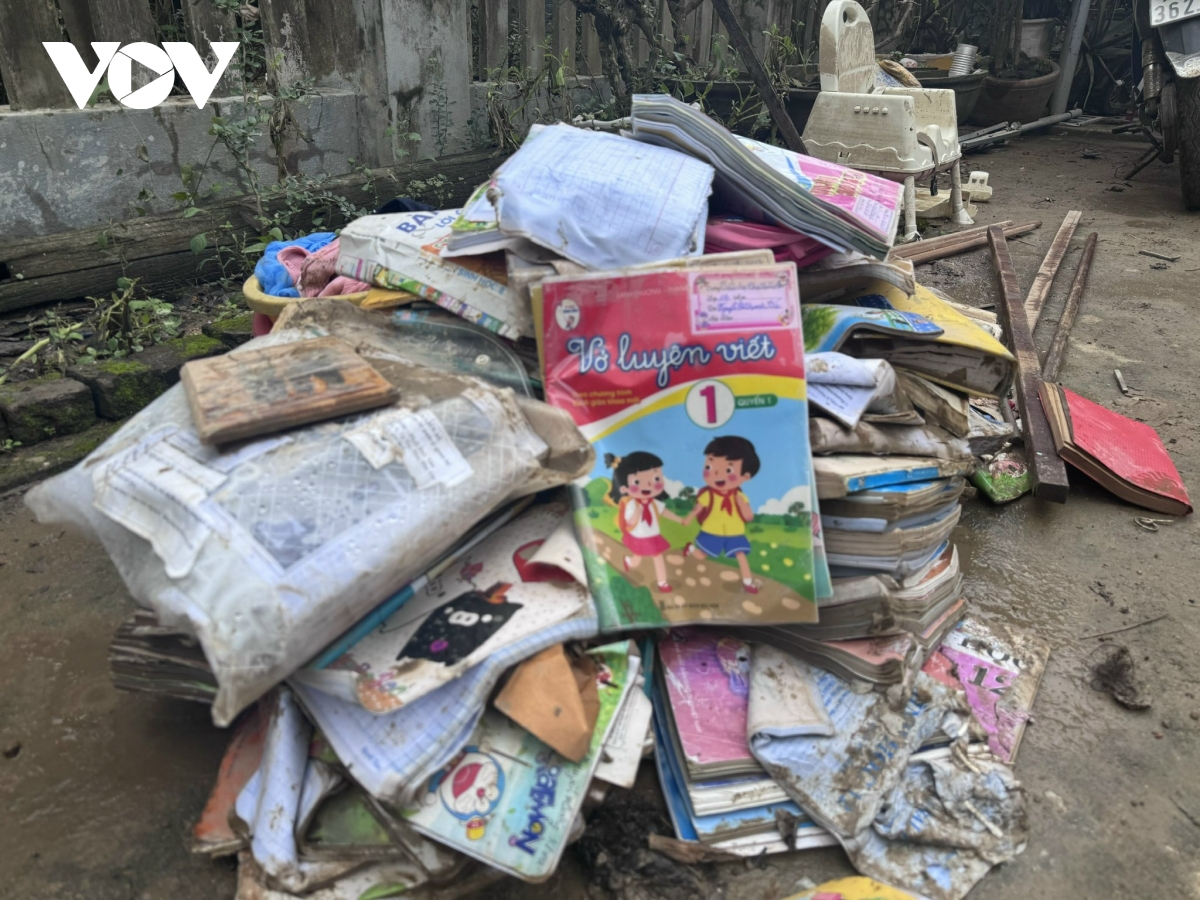 Sách giáo khoa của đa số học sinh vùng lũ ở các xã phía Đông tỉnh Đắk Lắk bị nước lũ nhấn chìm, ướt mục.