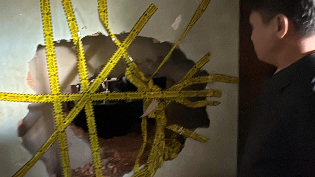 Lực lượng chức năng đục lỗ thủng từ nhà hàng xóm mới tiếp cận được vào bên trong để cứu người bị mắc kẹt. Ảnh: TT.