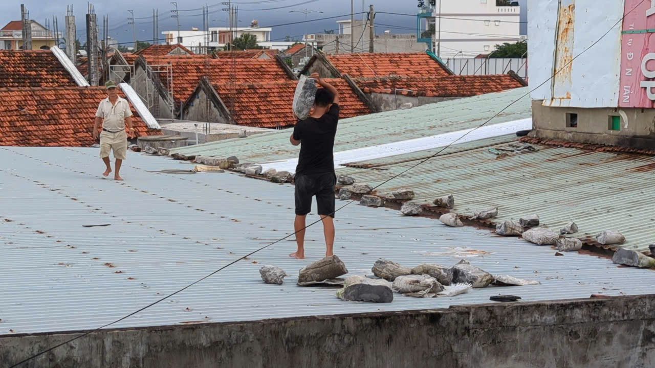 Người dân phường Hòa Hiệp, Đắk Lắk chuyển đá chặn trên mái nhà, phòng mưa bão.
