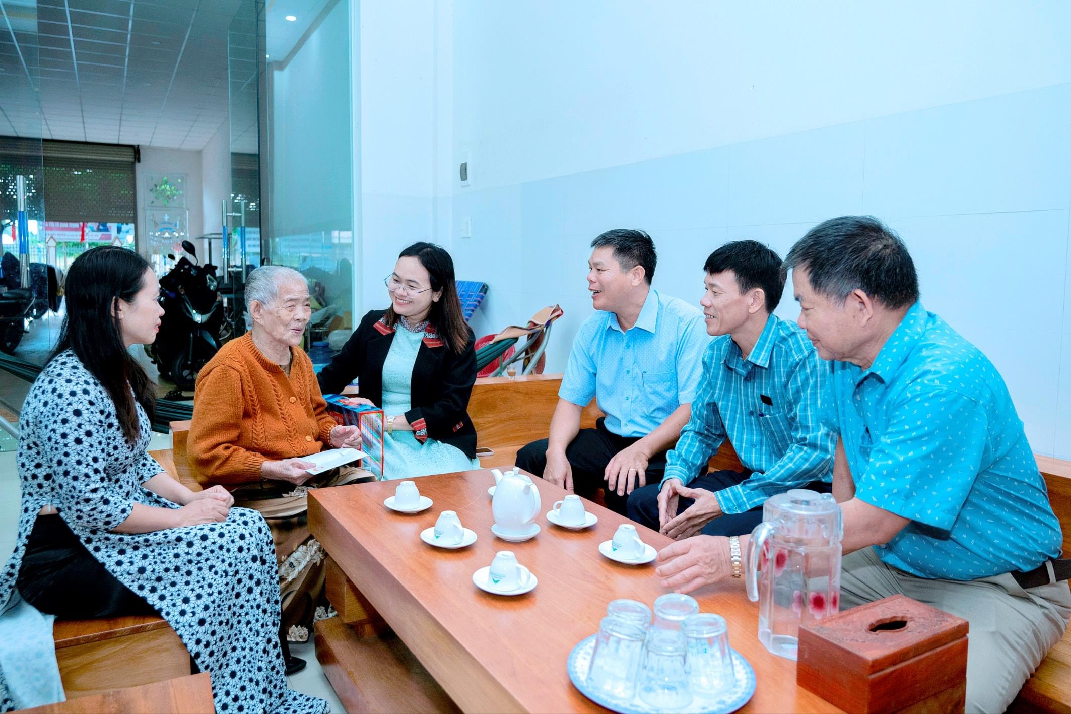 Chủ tịch Ủy ban Mặt trận Tổ quốc Việt Nam phường Ea Kao, H' Hương Bkrông (ở giữa) thăm Mẹ Việt Nam Anh hùng Bùi Thị Đấy (104 tuổi, có 2 con là liệt sĩ)
