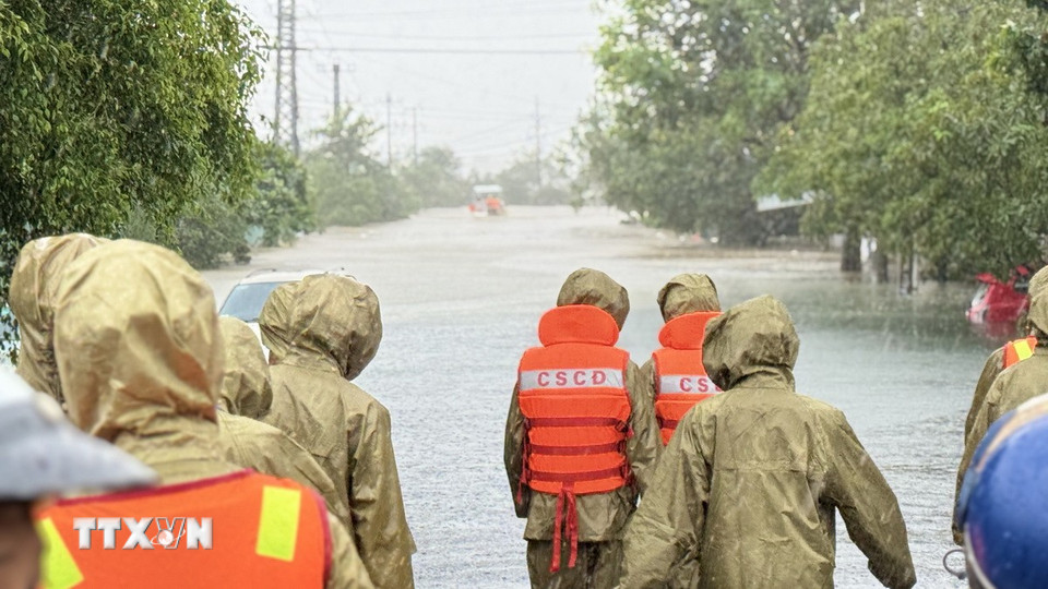 Lực lượng chức năng có mặt vùng ngập lũ từ sáng sớm 19/11. (Ảnh: Tường Quân/TTXVN)