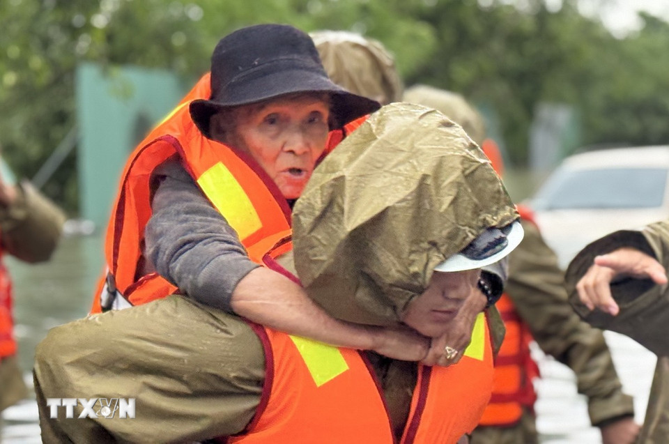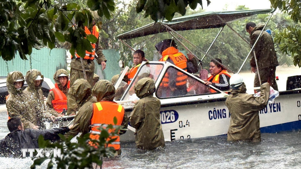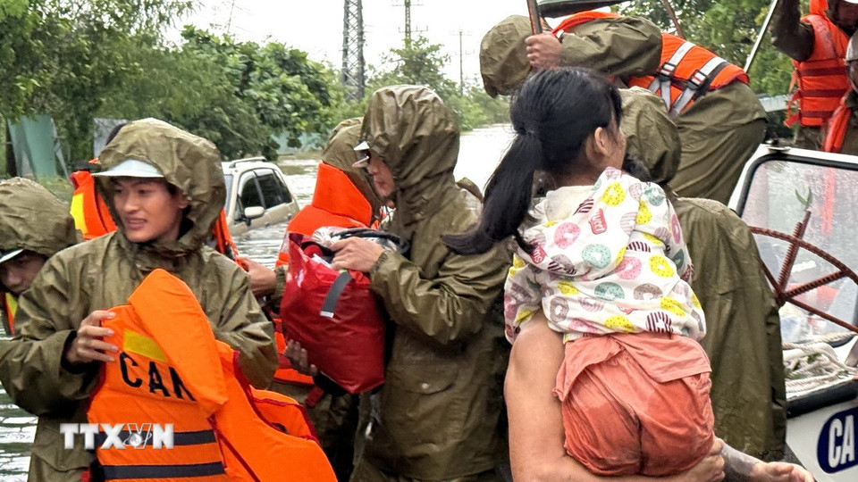 Cứu giúp trẻ em và di dời đồ đạc cho người dân.( Ảnh: Tường Quân/TTXVN)