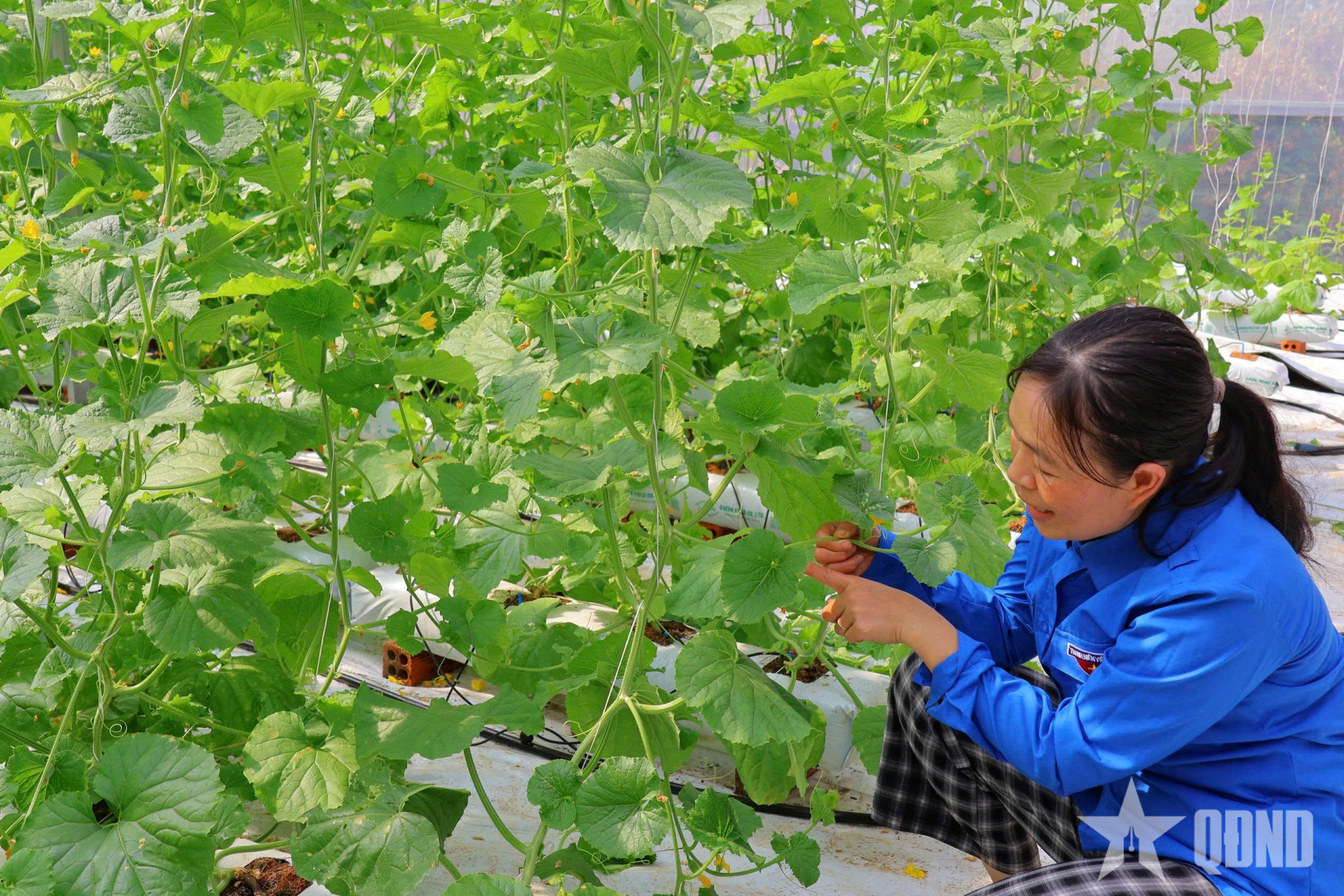 Chị Hoàng Thị Ánh Nhi chăm sóc vườn dưa lưới của gia đình tại xã Ea Wer (tỉnh Đắk Lắk).