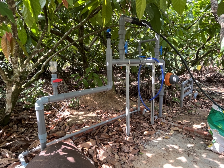 Thứ hai, áp dụng hệ thống tưới nhỏ giọt. Mô hình này giúp tiết kiệm đến 30% lượng nước sử dụng, đồng thời giảm đáng kể nhân lực lao động trong tưới tiêu và bón phân. Bên cạnh đó, nông dân còn được hướng dẫn sử dụng phụ phẩm nông nghiệp như vỏ ca cao và lá cây để sản xuất phân compost, giúp cải thiện độ phì nhiêu của đất mà không làm tăng chi phí đầu vào.