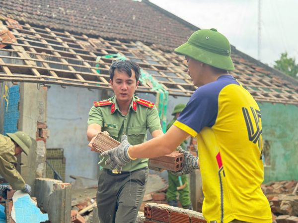 Đoàn viên thanh niên Công an tỉnh hỗ trợ người dân dọn dẹp, lợp lại nhà sau cơn lũ.