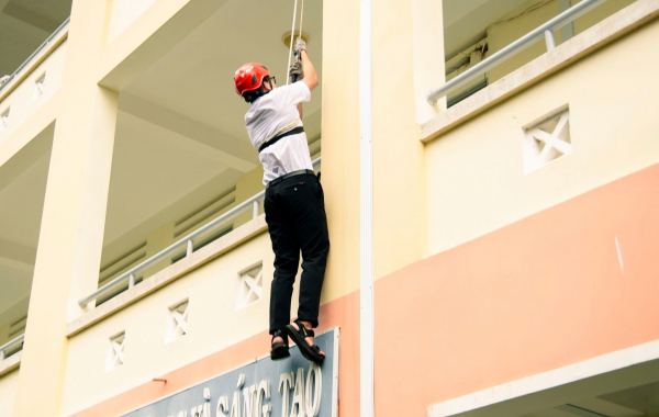 Học sinh thực hành thoát nạn từ trên cao xuống bằng dây hạ chậm.