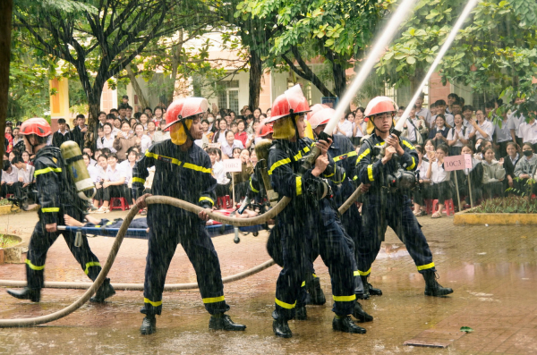 Giáo viên và học sinh của trường sôi nổi và hào hứng tham gia hoạt động trải nghiệm, thực hành CC&CNCH gồm 7 phần: Trải nghiệm thoát nạn trong môi trường có nhiều khói, trong không gian hạn chế khi xảy ra cháy; thực hành sử dụng bình chữa cháy xách tay dập tắt đám cháy; di chuyển người bị nạn; rải vòi chữa cháy; phun nước chữa cháy; thoát nạn từ trên cao xuống bằng dây hạ chậm và sơ cứu người bị nạn.