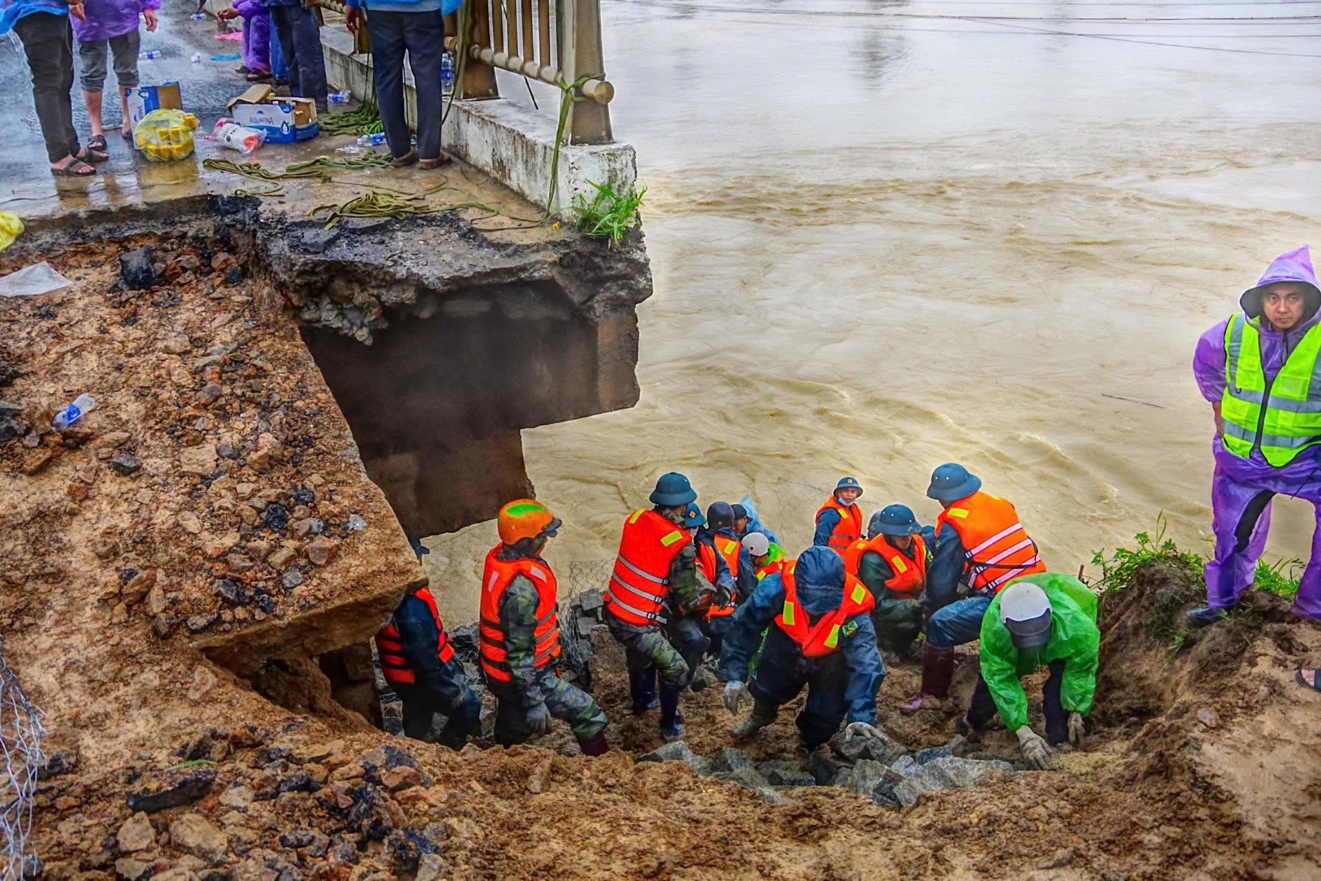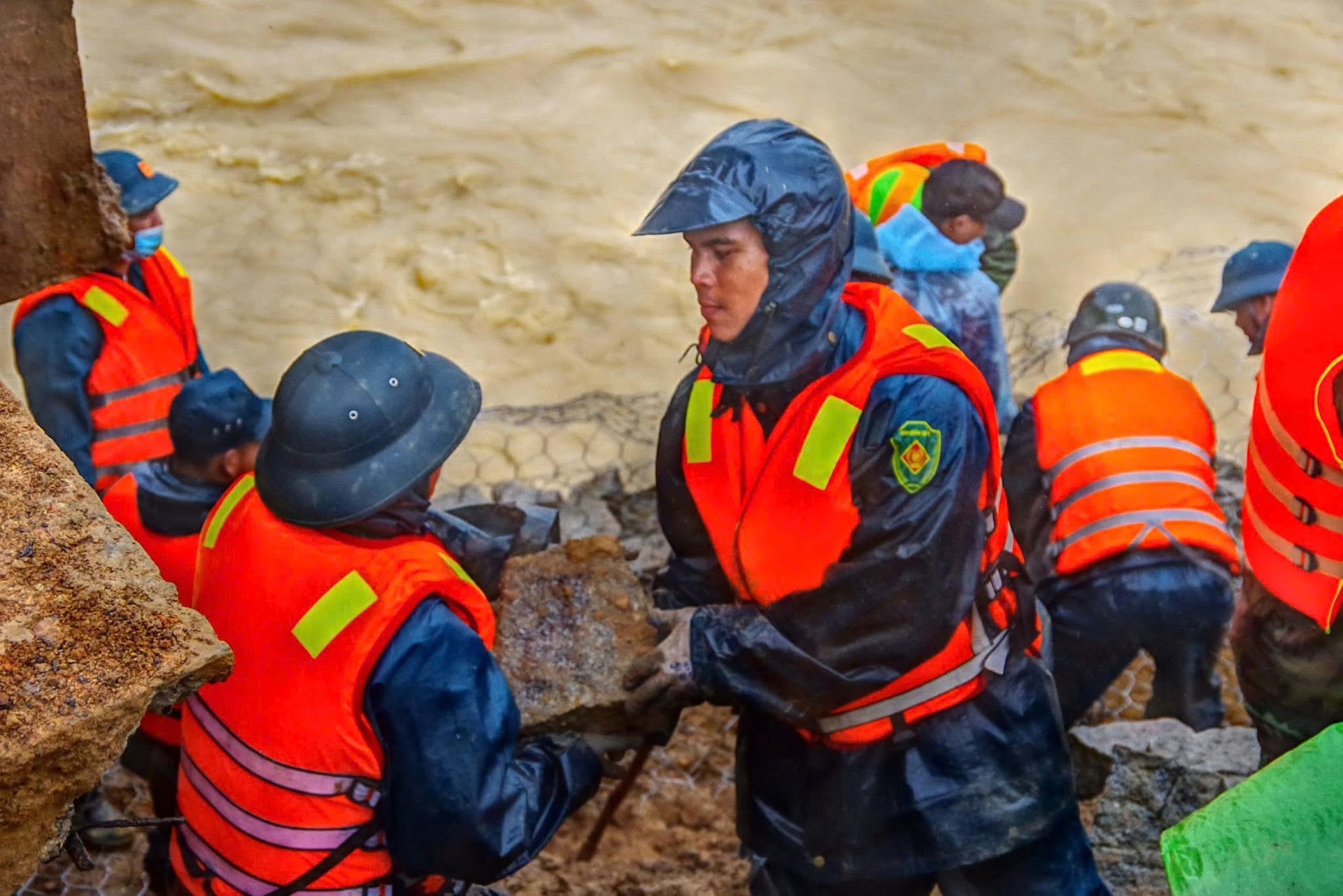 Lực lượng cứu hộ quyết tâm giữ vững cây cầu. Ảnh: Đắc Thái.