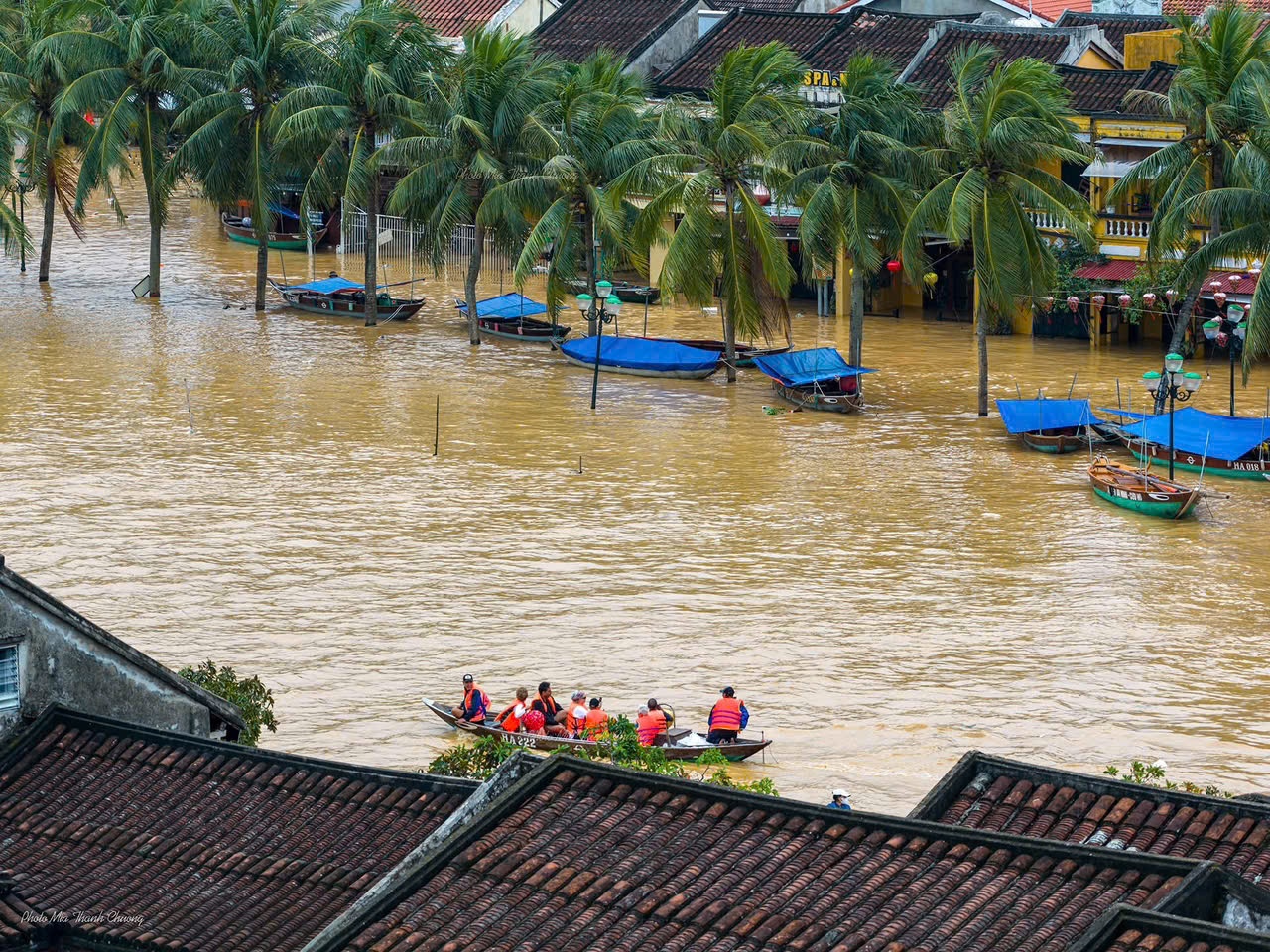 Ngày 19/11, Hội An tái ngập vì mưa lớn. Nhiều hộ kinh doanh, dịch vụ du lịch phải đóng cửa chỉ sau ít ngày dọn dẹp. Người dân chủ yếu di chuyển bằng thuyền trong khu vực phố cổ. Ảnh: Mai Thanh Chương.