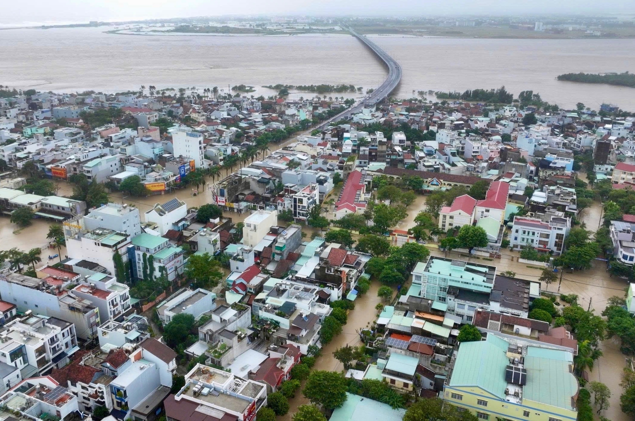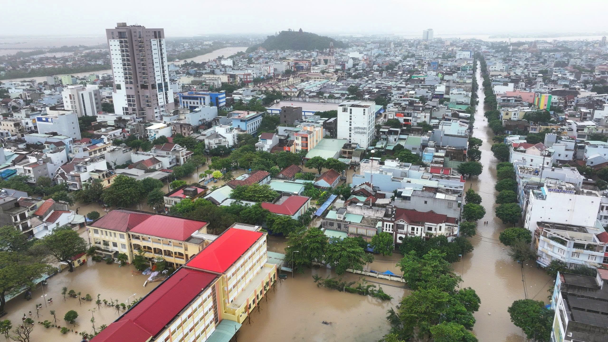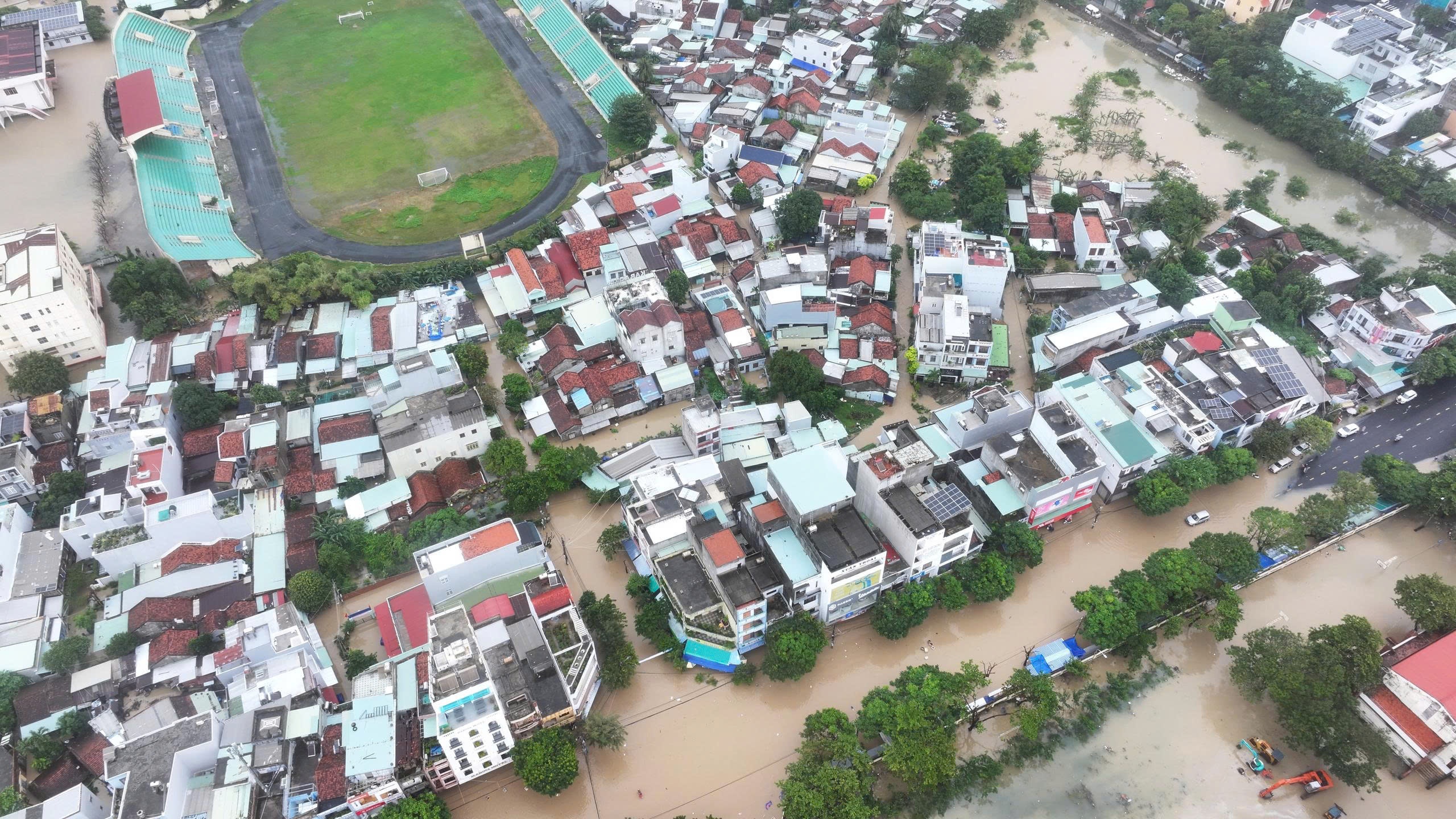 Mưa lớn kéo dài cùng với các thủy điện xả lũ đã khiến nhiều khu vực của tỉnh Đắk Lắk ngập sâu ngày 19/11. Lúc 9h sáng, Trung tâm Dự báo Khí tượng Thủy văn Quốc gia đã ban hành cảnh báo cấp độ rủi ro thiên tai cấp 4 đối với khu vực phía Đông tỉnh Đắk Lắk (Phú Yên cũ). Trong ảnh là khung cảnh chụp từ trên cao đường Trần Hưng Đạo, Lê Lợi (phường Tuy Hòa). Ảnh: Nghinh Phong Media.