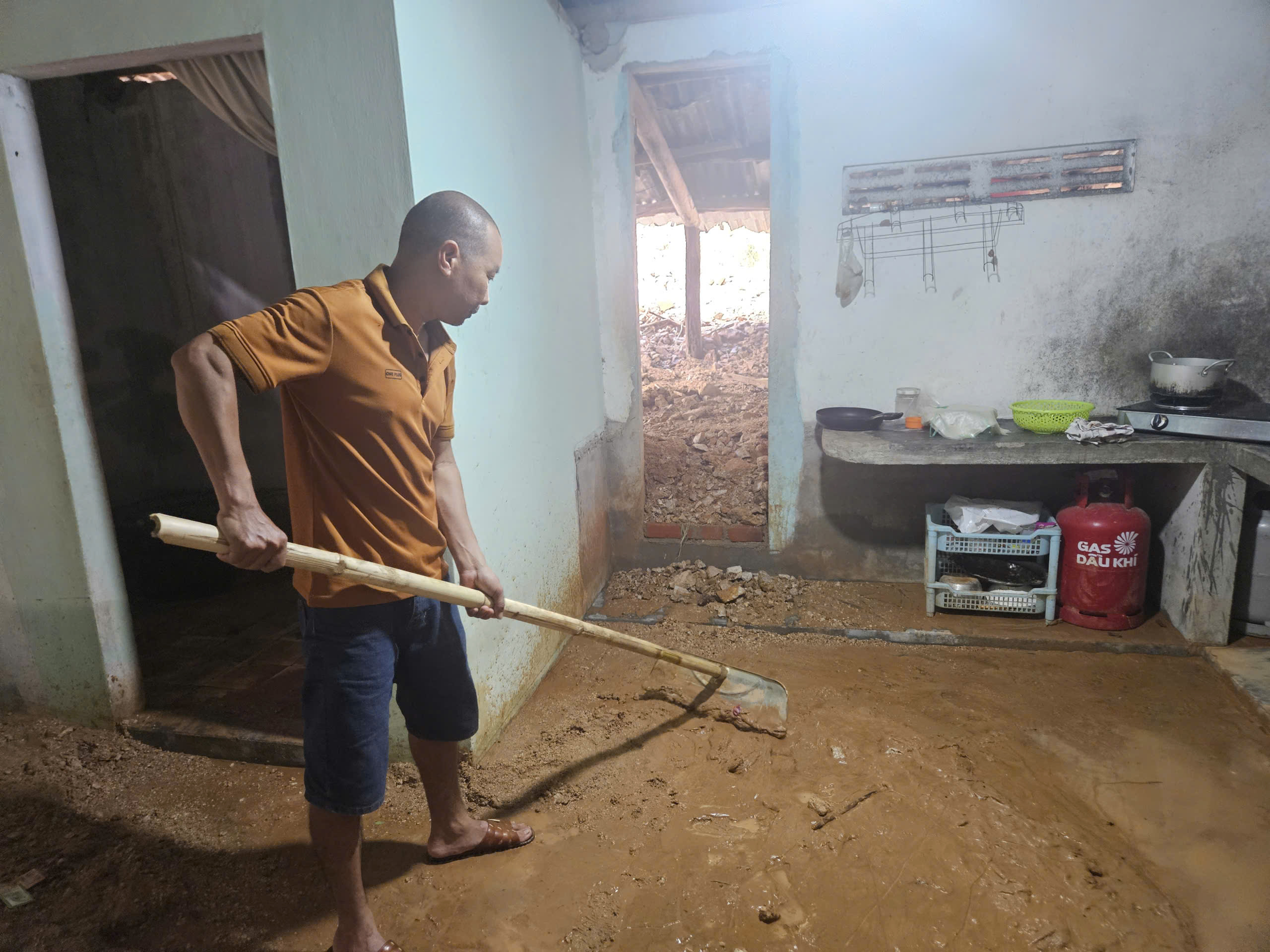 Vụ sạt trượt đất khiến ít nhất 4 hộ dân tại thôn Long Bình bị ảnh hưởng. Đất đá tràn vào nhà làm hư hỏng một số tài sản.