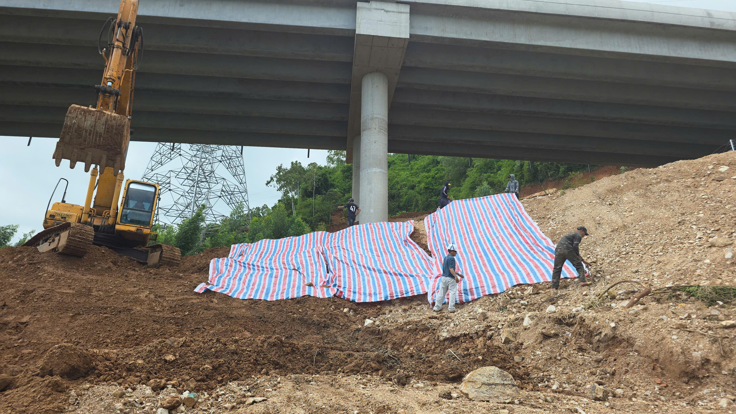 Đơn vị thi công đã san gạt đất và dùng bạt phủ taluy để tránh tình trạng sạt trượt đất