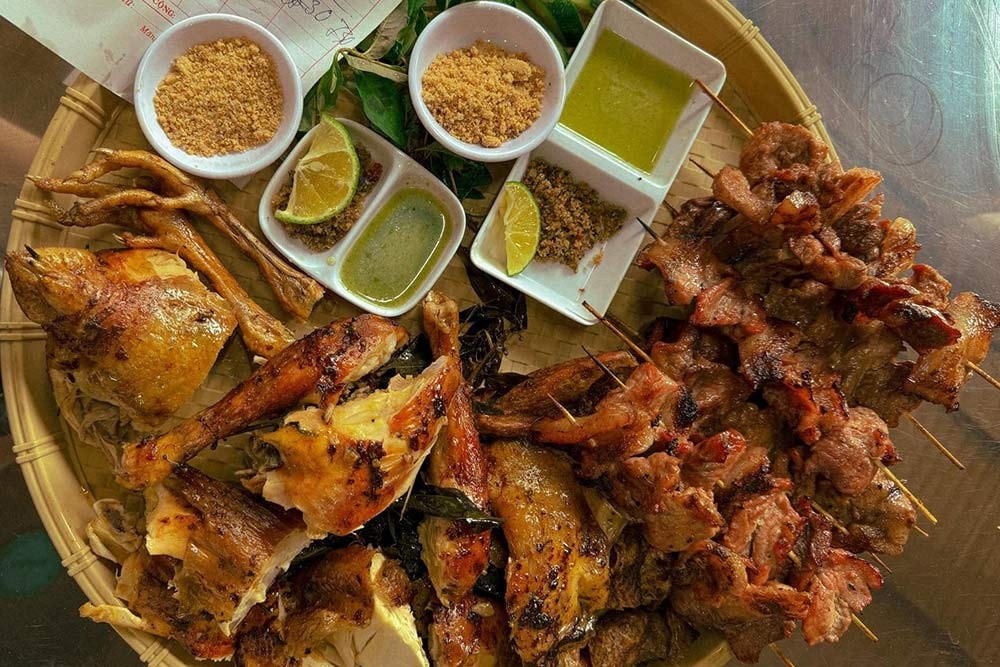 Gà nướng cơm lam: Gà thả vườn được tẩm ướp gia vị đặc trưng rồi nướng trên than hồng, ăn kèm với cơm lam dẻo thơm nấu trong ống tre.