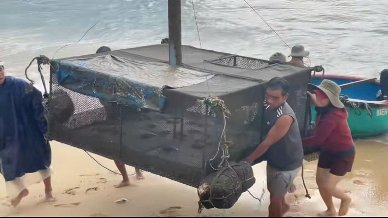 Người dân các xã ven biển tỉnh Đắk Lắk đưa các lồng nuôi hải sản lên bờ tránh thiệt hại.