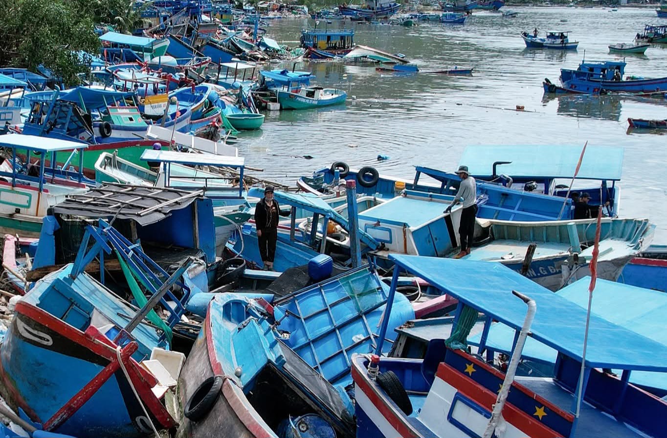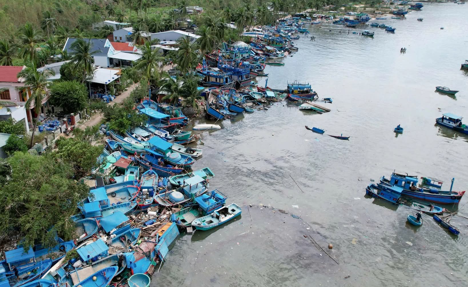 Làng chài tiêu điều với ghe tàu, lồng bè bị bão lũ dồn dập làm hư hỏng, chất chồng lên nhau và bể nát.