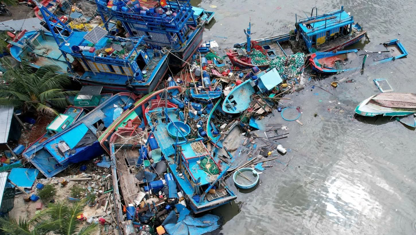 Hàng chục tàu đánh cá trước đó bị các cơn bão xô dạt cuộn lại thành đống. Các chủ tàu xót của nhưng chưa biết giải quyết tài sản như thế nào.