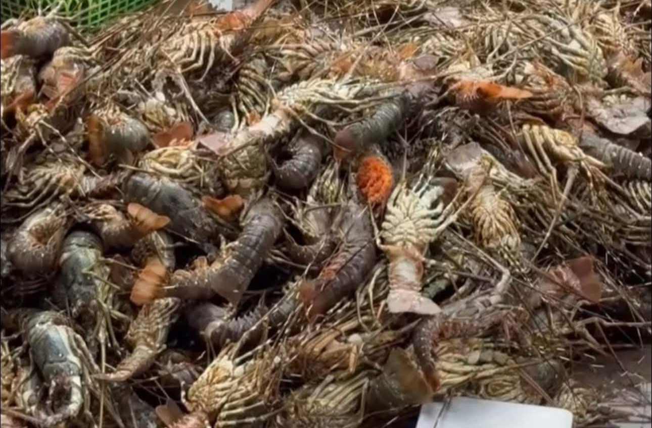 Xác tôm hùm chết. Người dân bòn mót bóc lấy thân tôm mong vớt vát, còn vỏ chất đống bên vệ đường.