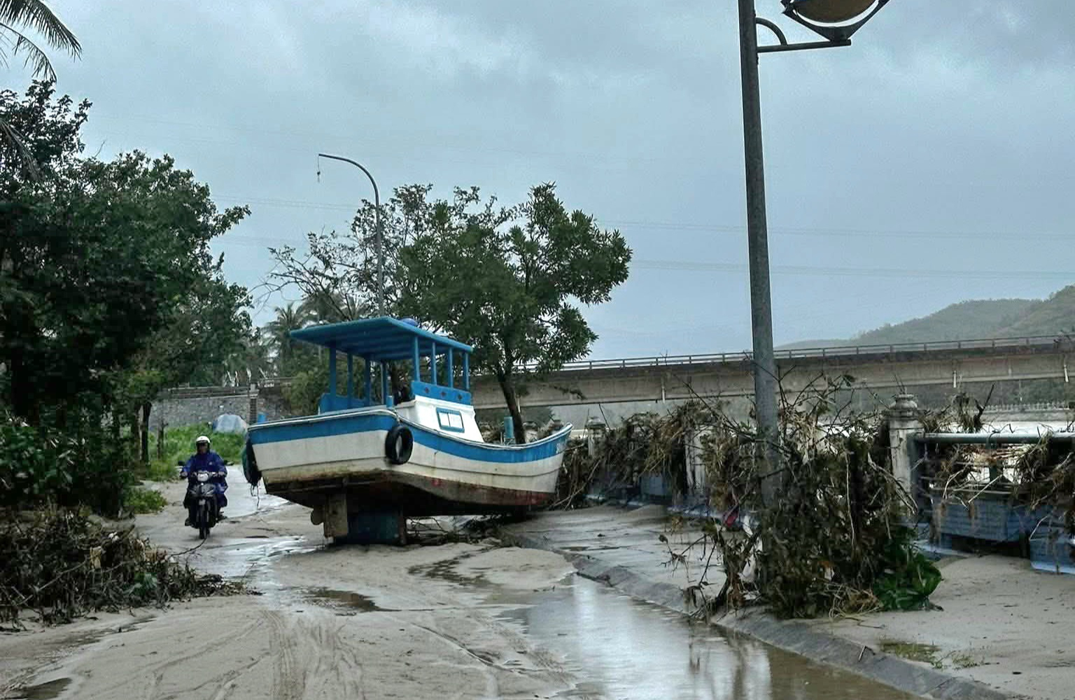 Một ghe đánh cá bị lũ dữ đưa lên bờ và mắc cạn giữa đường giao thông.