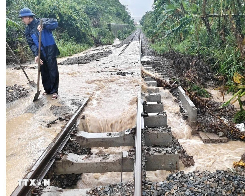 Một đoạn đường sắt đi qua tỉnh Đắk Lắk bị mưa lũ làm hư hỏng. (Ảnh: TTXVN phát)