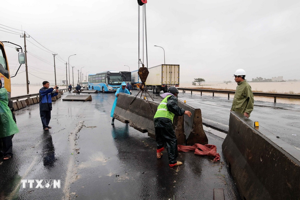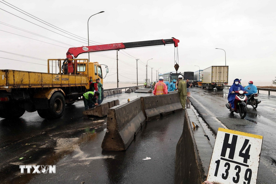 Nỗ lực khắc phục dải phân cách cứng bị trôi dạt trên Quốc lộ 1A. (Ảnh: Đỗ Trưởng/TTXVN)