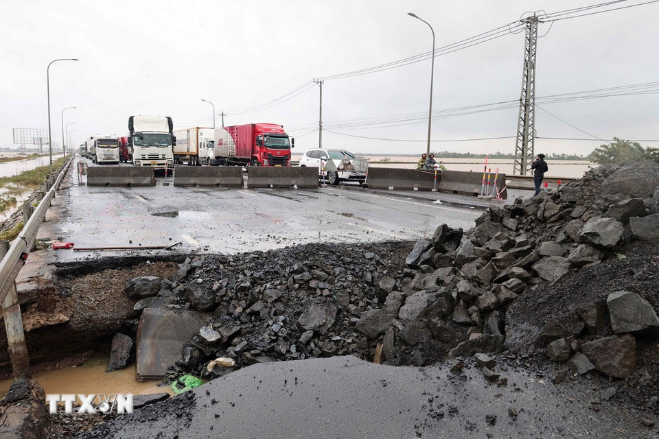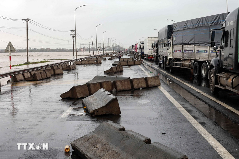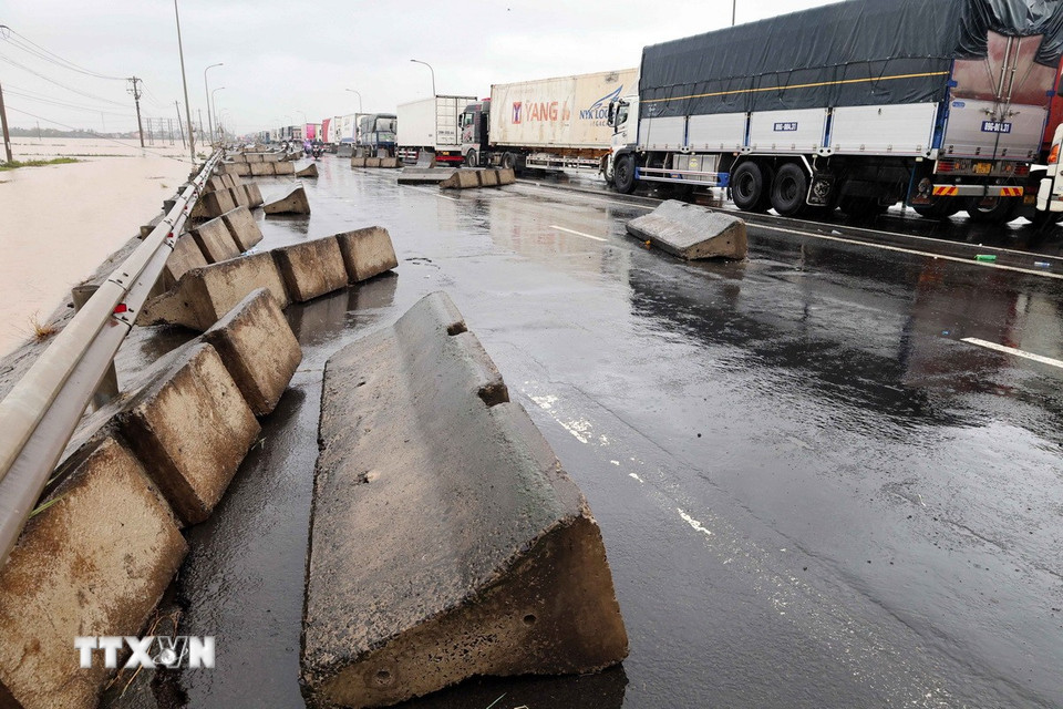 Dải phân cách cứng bị trôi dạt trên Quốc lộ 1A. (Ảnh: Đỗ Trưởng/TTXVN)