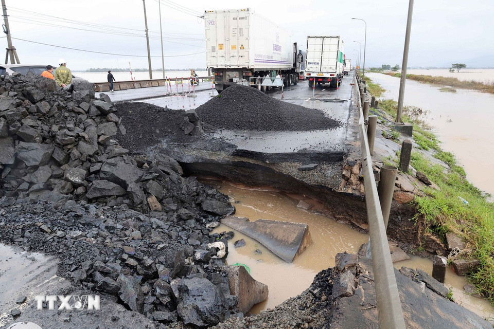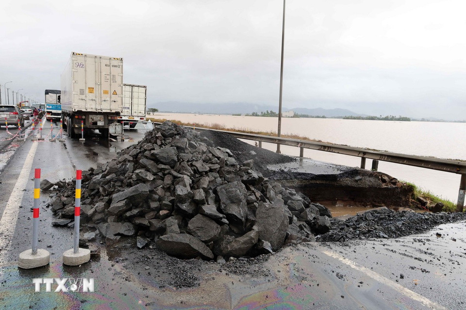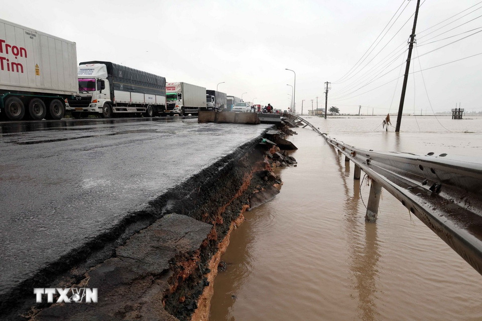 Quốc lộ 1A qua địa bàn phường Phú Yên (Đắk Lắk) có vị trí bị xói lở nghiêm trọng, ảnh hưởng đến việc đi lại của các phương tiện. (Ảnh: Đỗ Trưởng/TTXVN)