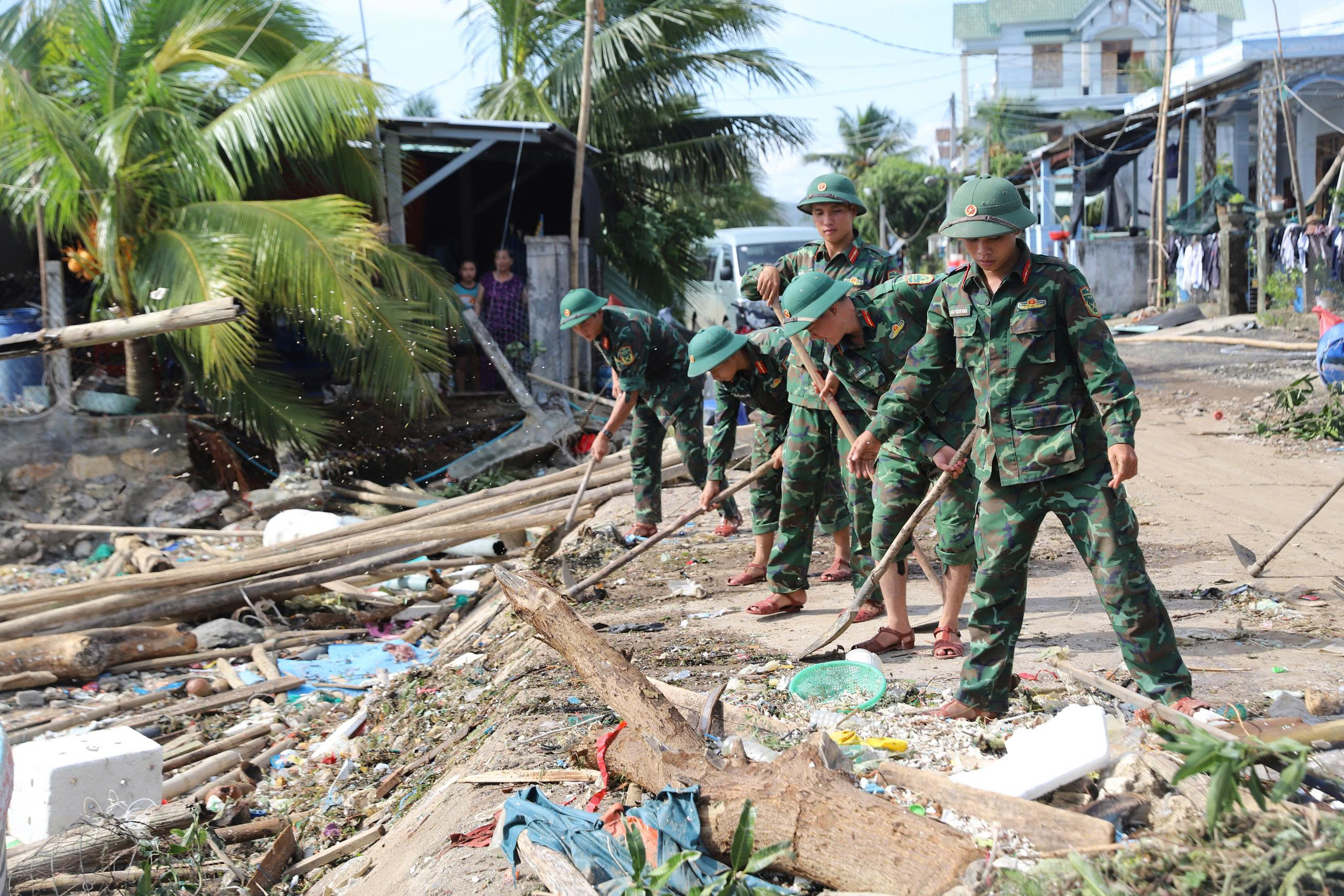 Lực lượng quân đội tại phường Sông Cầu đang hỗ trợ người dân dọn dẹp sau bão