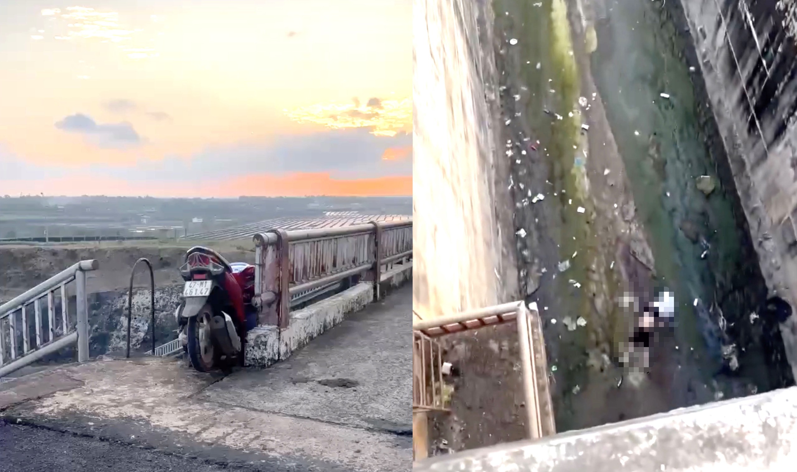Phát hiện người đàn ông tử vong dưới cửa xả đập chứa nước Krông Búk hạ, trên thành cầu có chiếc xe máy lơ lửng. (Ảnh cắt từ clip)