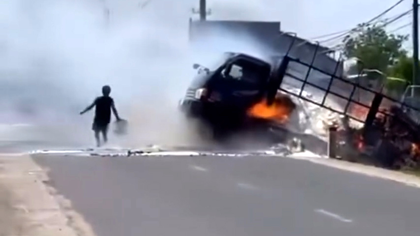 Video: Tài xế nhanh trí lùi xe xuống mương nước dập lửa khi xe tải chở cám bốc cháy.