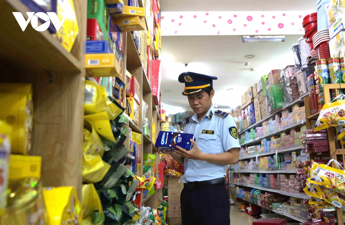 Một kiểm soát viên Tổ công tác số 1 – Đội Quản lý thị trường số 4 kiểm tra hàng bánh kẹo tại cửa hàng tạp hóa ở phường Tân Lập, tỉnh Đắk Lắk.