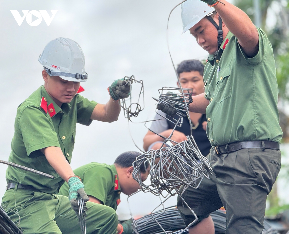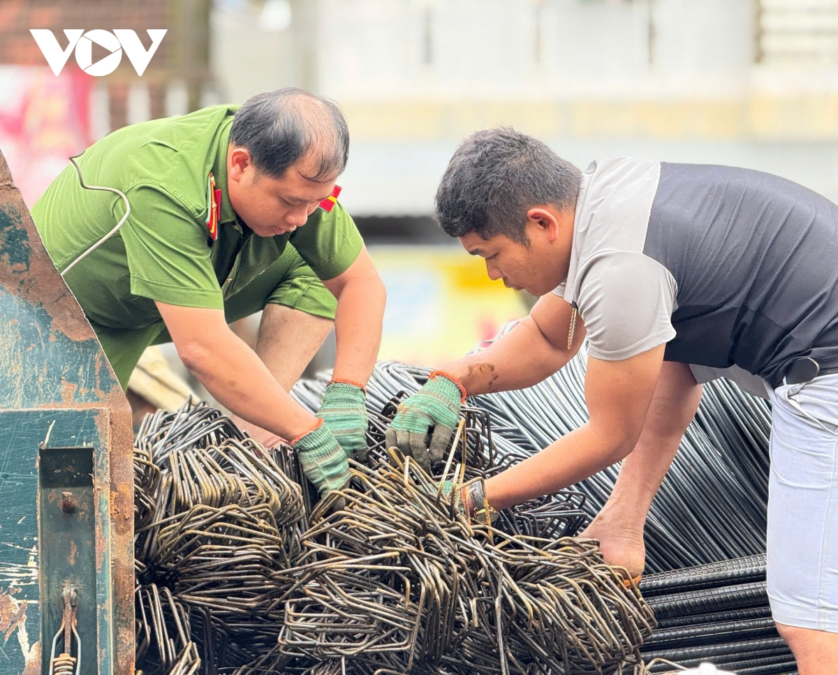 Hai cán bộ Công an tỉnh Đắk Lắk đang vận chuyển sắt đai để đổ cột trụ móng, xây nhà hỗ trợ một hộ dân bị sập nhà tại xã Hòa Thịnh, tỉnh Đắk Lắk.