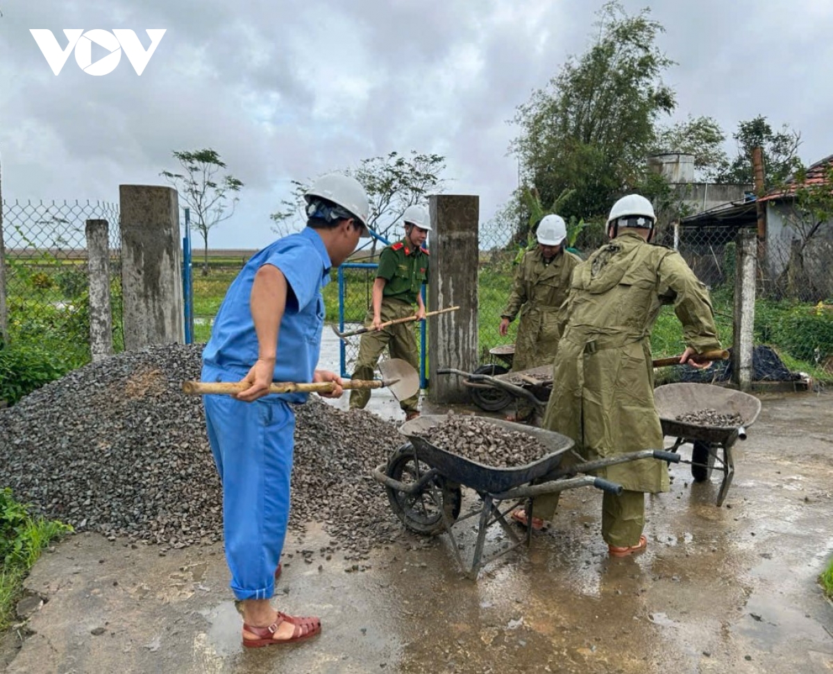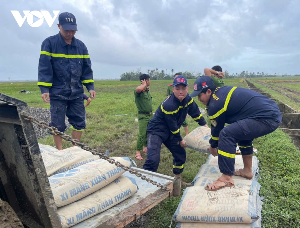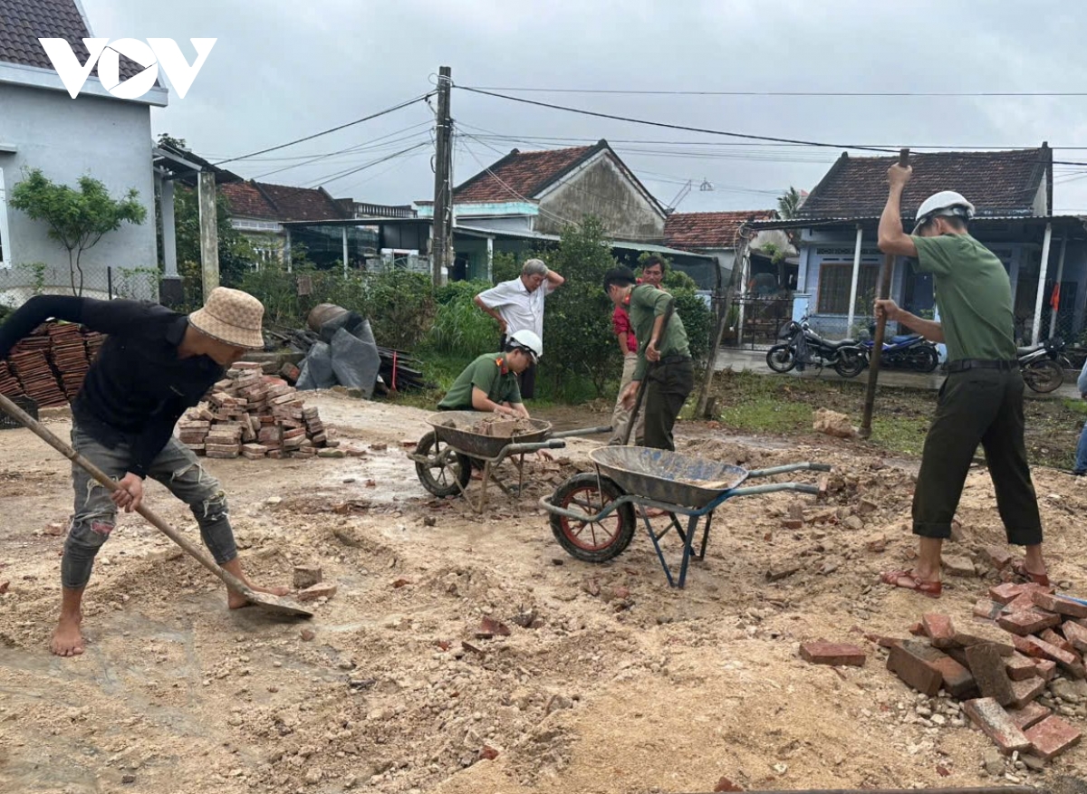 Nhóm cán bộ, chiến sĩ Phòng Cảnh sát Phòng cháy chữa cháy và Cứu nạn cứu hộ vận chuyển xi măng hỗ trợ các gia đình bị sập nhà tại xã Hòa Thịnh, tỉnh Đắk Lắk.