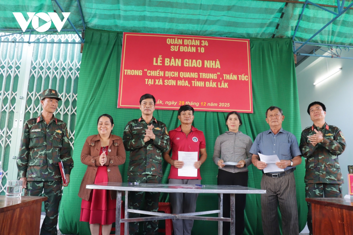 Tỉnh Đắk Lắk dự kiến đến ngày 15/1 sẽ hoàn thành khoảng 56% số nhà xây mới và phấn đấu cán đích 100% vào ngày 25/1/2026, kịp thời giúp người dân ổn định đời sống sau thiên tai. "Chiến dịch" nhận được sự vào cuộc quyết liệt của cấp ủy, chính quyền và lực lượng vũ trang với tinh thần “thần tốc thi công, thần tốc về đích”. Cùng với đó là sự chung tay của các nhà hảo tâm, tổ chức quốc tế và nguồn lực xã hội hóa, bảo đảm kinh phí xây dựng, sửa chữa nhà ở cho người dân bị thiệt hại.