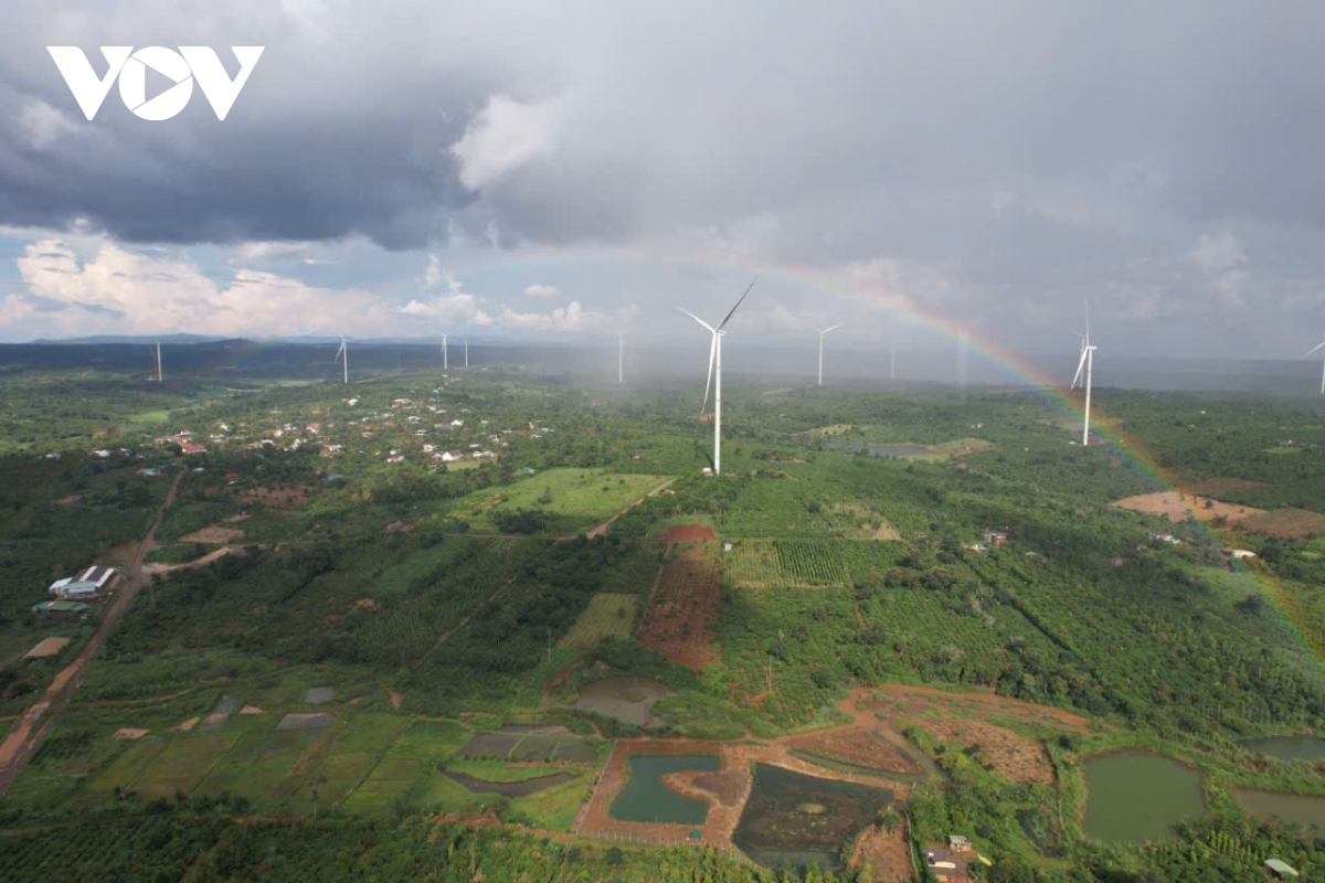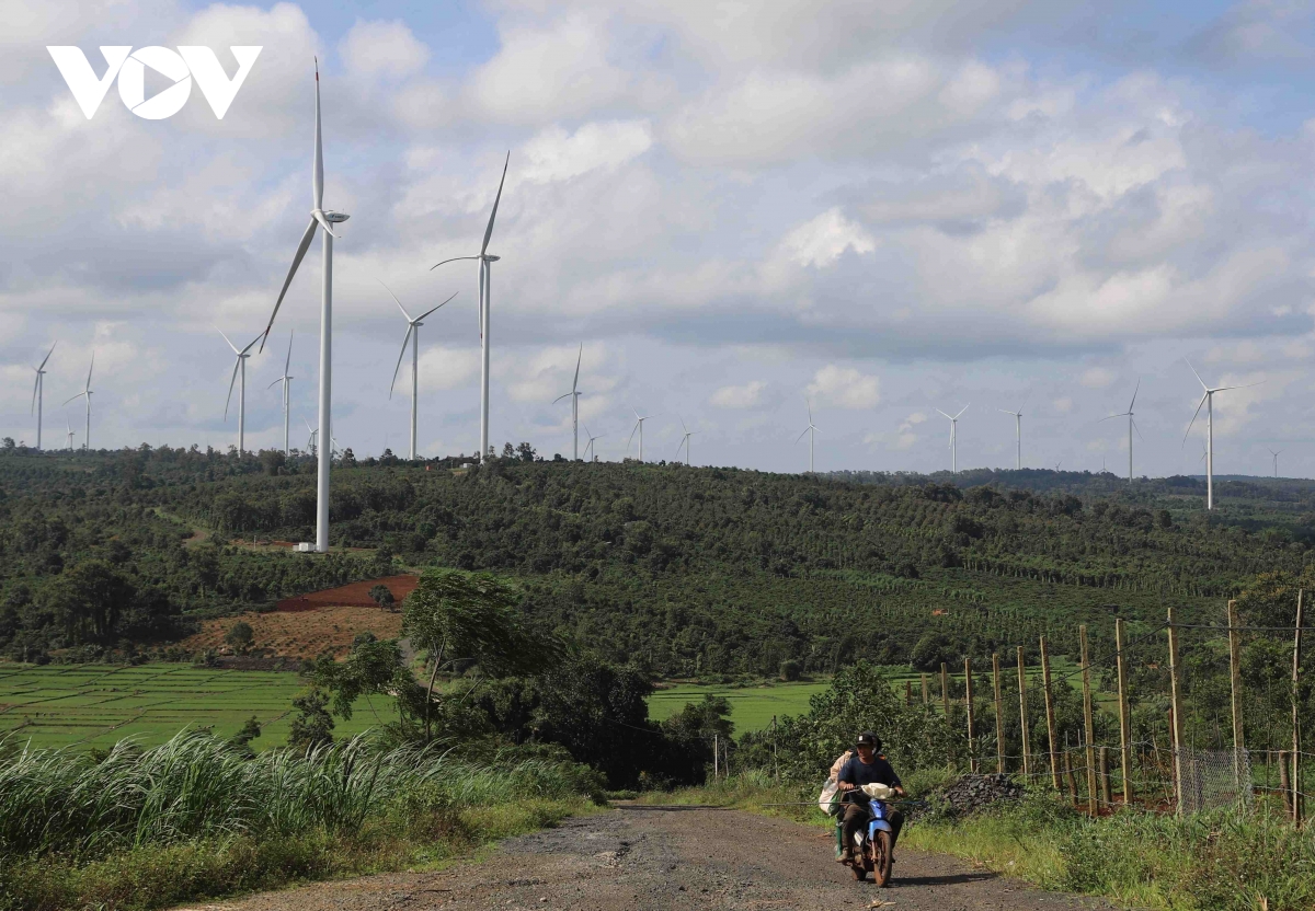 Tổ hợp 4 nhà máy điện gió với 73 trụ quạt đặt trên đồi cao thuộc hai xã Krông Búk và Cư Pơng, tỉnh Đắk Lắk.