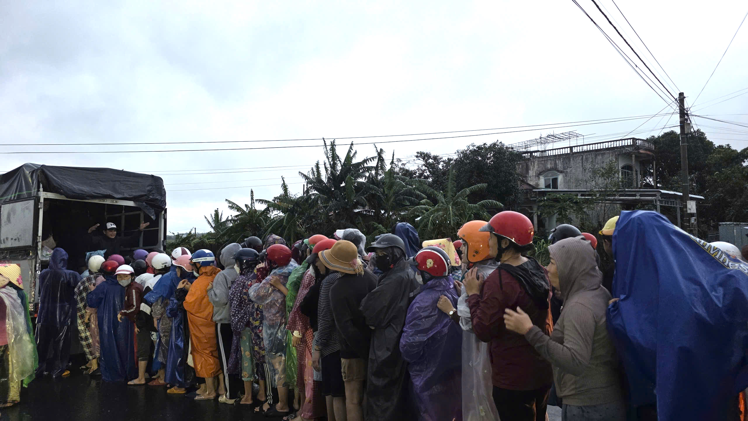 Hàng trăm người dân Hòa Thịnh đội mưa, đứng xếp hàng dài bên tuyến đường chính để chờ nhận cứu trợ. Có những cụ già, những em nhỏ co ro trong giá rét.