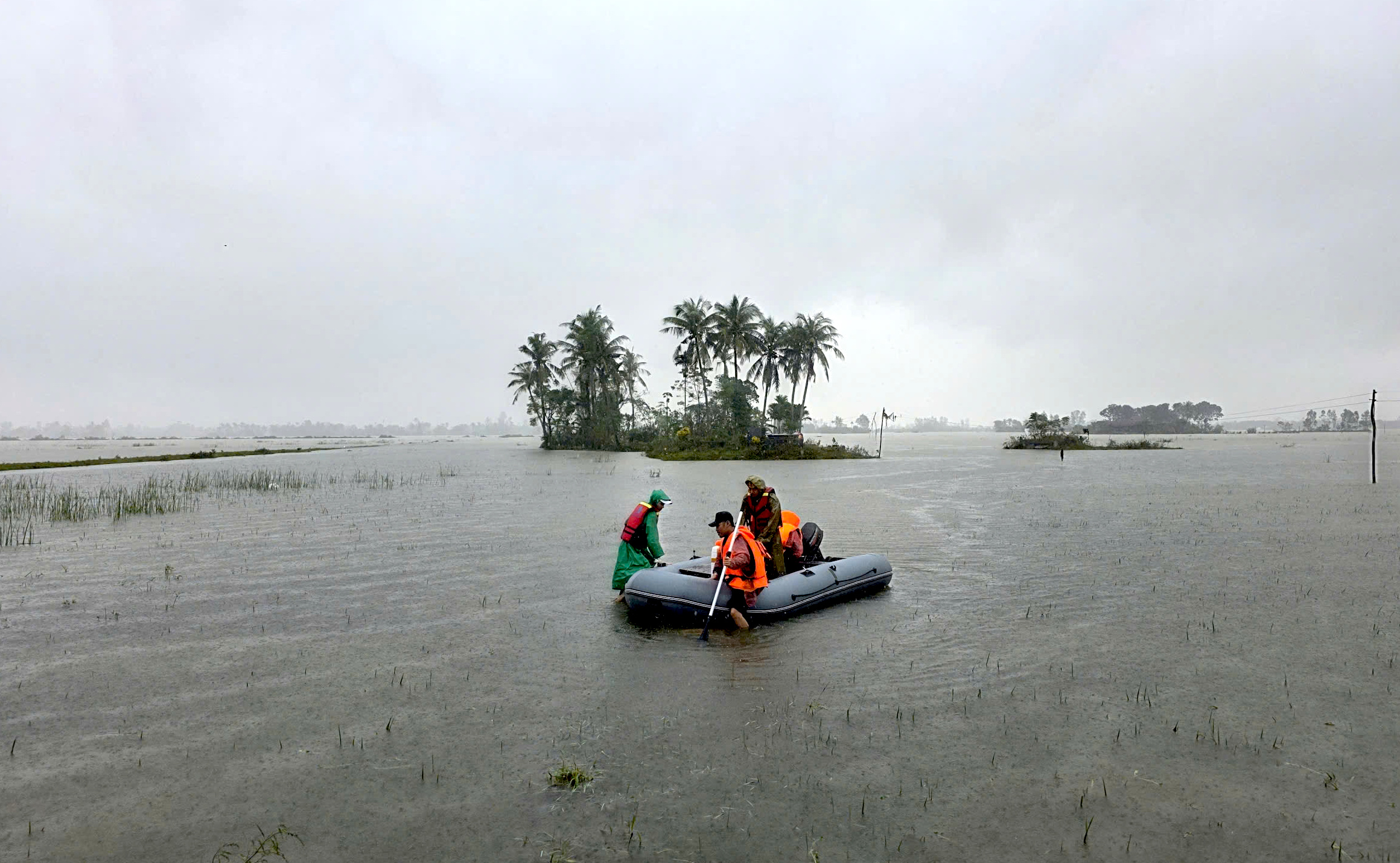 Tâm lũ Hòa Thịnh đã qua cơn nguy cấp, nước đã rút dần nhưng mưa vẫn không ngừng trút xuống và xóm làng nhiều nơi vẫn còn mênh mông nước.