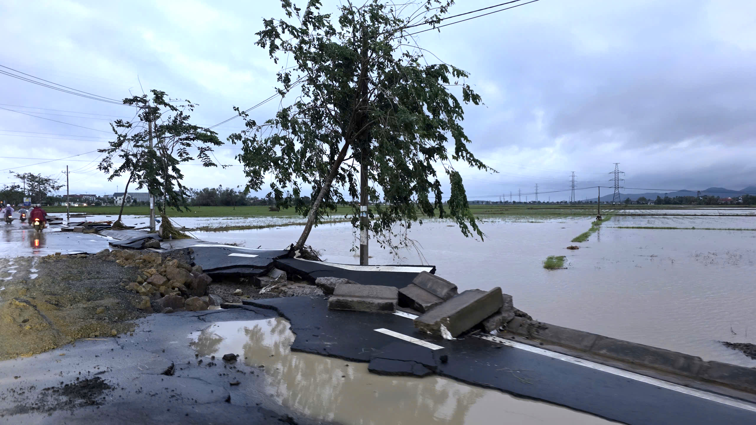 Sau khi lũ quét qua, con đường dẫn vào trung tâm xã Hòa Thịnh giờ chỉ còn là những vệt nứt toác. Mặt đường nhựa bị nước kéo sụp từng mảng lớn.