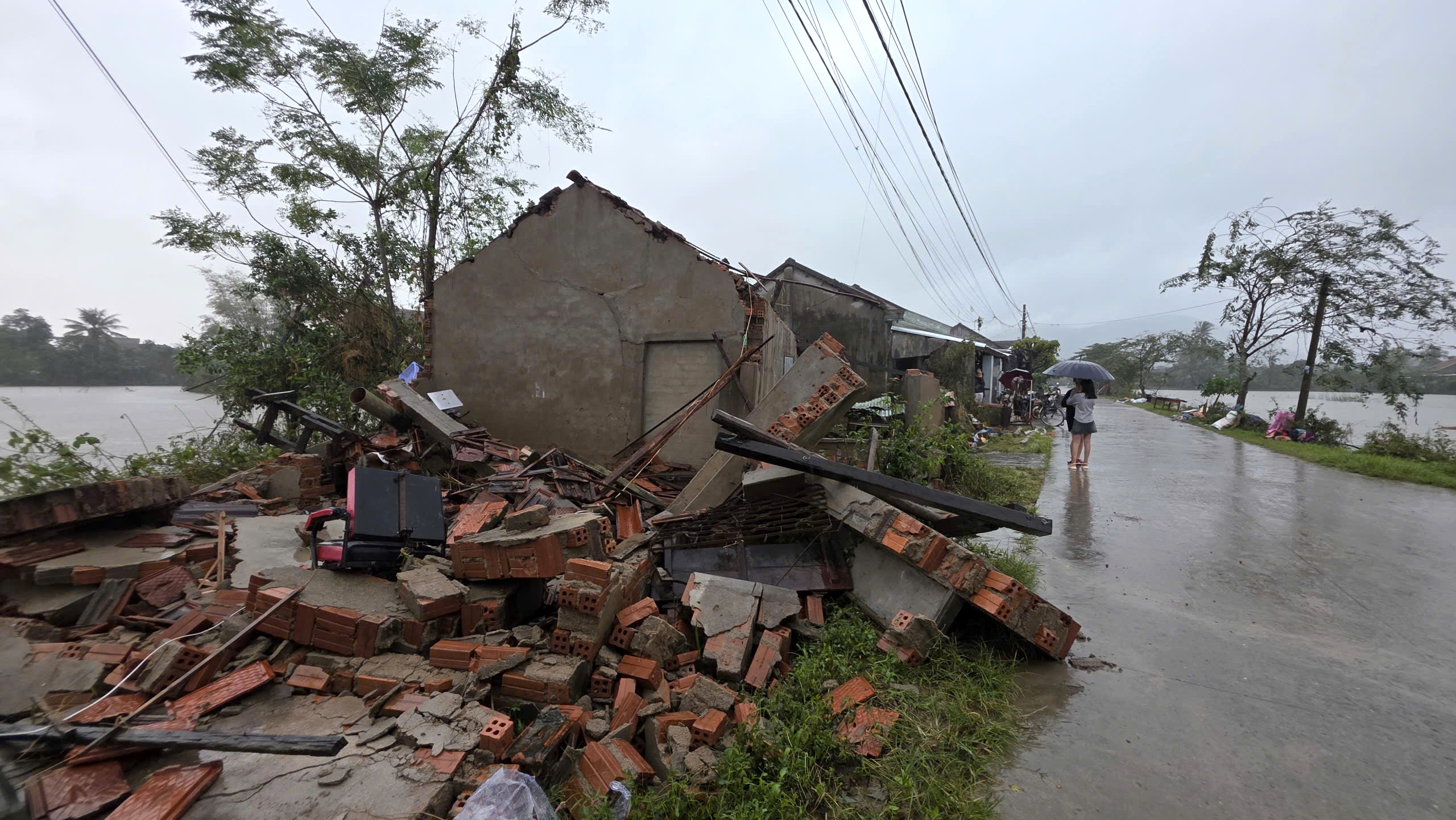 Một căn nhà ven đường ở rốn lũ Hòa Thịnh chỉ còn lại một mảng tường đổ nát, ngổn ngang.