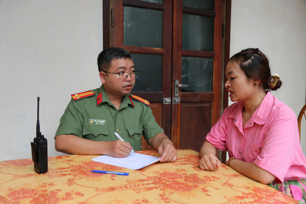Trung tá Trần Thanh Tùng tiếp nhận thông tin trình báo của chị Lê Thị Thanh Huyền về việc con trai bị đi lạc.